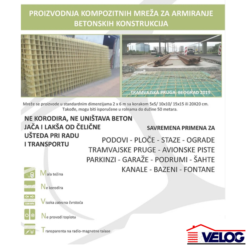 | Prednosti | • Otpornost na vlagu i hemikalije – bez korozije tokom eksploatacije; • Niska toplotna provodljivost – sprečava pojavu "hladnih mostova"; • Manja težina u odnosu na čelik do 5 puta (lakši transport i ugradnja); • Visoka zatezna čvrstoća (veća od čelika po jedinici mase); • Lako se seče i ugrađuje bez posebnog alata; • Ekološki prihvatljiv proizvod, bez uticaja na armirani beton; • Dugotrajna zaštita bez dodatnih premaza; • Pogodna za temelje, podne ploče, staze, ograde, vinogradarske i poljoprivredne objekte. |