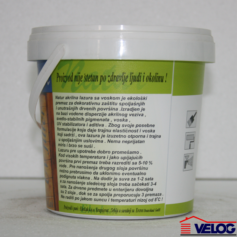 Natur akrilna lazura sa voskom je ekološki premaz za dekorativnu zaštitu spoljašnjih i unutrašnjih drvenih površina.Izrađen je na bazi vodene disperzije akrilnog veziva,svetlo-stabilnih pigmenata, voska, UV stabilizatora i aditiva.Zbog svoje posebne formulacije koja daje trajnu elastičnost i voska koji sadrži, ova lazura je izuzetno otporna i trajna u spoljašnjim uslovima.Nema neprijatan miris i brzo se suši.