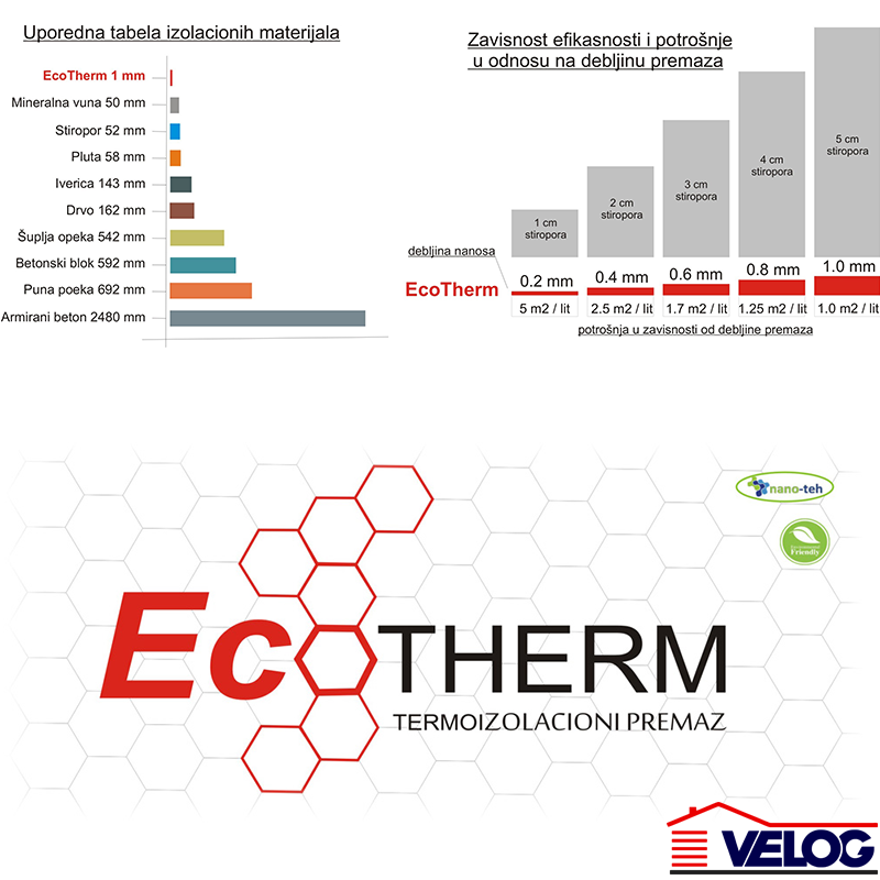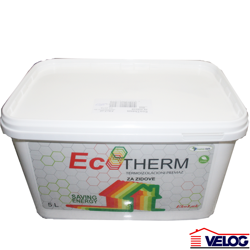 EcoTherm termoizolacioni premaz za zidove je ekološki proizvod bez neprijatnih mirisa namenjen za nanošenje na unutrašnje zidove radi postizanja toplotne udobnosti i uštede troškova energije . Zdravstvenu ispravnost ispitao - Jugoinspekt - Beograd . EcoTherm je proizvod najsavremenije nano tehnologije sa izuzetnim termoizolacionim i reflektujućim karakteristikama . To se postiže pomoću nano čestica u obliku šupljih lopti veoma malih dimenzija . EcoTherm ima veoma nizak koeficijent toplotne provodljivosti ƛ =0.0016 W/ (m.k) ( IMS - Beograd ) i u kombinaciji sa reflektujućim osobinama omogućava da se temperatura ravnomerno rasporedi i ostaje u prostoriji . Zidovi premazani sa EcoTherm - om postaju topliji pa samim tim sprečavaju pojavu kondenzacije i buđi .
