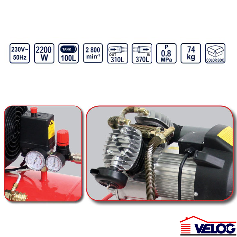 | Karakteristike | • Snaga: 2200 W • Broj obrtaja praznog hoda: 2800 min-1 • Maksimalan pritisak: 0,8 MPa • Kapacitet boce: 24 L • Ulazni protok vazduha: 370L/min • Izlazni protok vazduha: 310 L/min • Težina: 74,0 kg • Dimenzije: 870 x 430 x 790 mm |