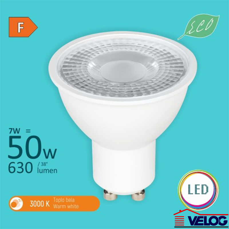 | Karakteristike | • LED:SMD • Tip grla:GU10 • Dimenzija sijalice:Ø50 x H55mm • Oblik:MR16 • Radni napon:220~240V • Radna frekvencija:50/60 Hz • Nominalna struja proizvoda:70mA • Power factor:>0,5 • Snaga (procenjena):7W • Potrošnja elek. energije:7 Kwh / 1000h • Energetska efikasnost 2019.:F • Ekvivalent (LED-Inkandes.):7W⇔50W • Lumen / Watt:80-90 • Lumen flux (nom.):630 (lm) • Temp. boje svetl.:3000 K (Toplo bela) • Vreme trajanja zagrev. do .:< 1s • Vreme startovanja:≤ 0,5 s • Ugao rasipanja svetlosti (.:38º • CRI - indeks reprodukcije.:≥80(Ra) • Faktor odražavanja svetlo.:≥0,8% / 6000h • Faktor LLMF na kraju nom. .:70% • Faktor preživljav. sij. (.:≥0,9/6000h • Indeks konzistentnosti boj.:≤ 6 sdcm • IP zaštita:IP20 • Materijal:Termoplastika • Stepen električne zaštit.:II klasa • Životni vek:20.000 h na 25° C • Sadržaj žive (Hg):Hg=0.0 mg • Temperatura okoline:-20~ +40 °C • Dimabilnost:Ne • ON-OFF ciklus prekida:10.000 X • Ispravno odlag. nakon upot.:WEEE • Napomena:Usmerena sijalica • Upotreba u domaćinstvu:Da • Upotreba u potpuno zatvore.:Ne • Upotreba u vlažnim prosto.:Ne • Dizajn vrha sijalice:Mat |