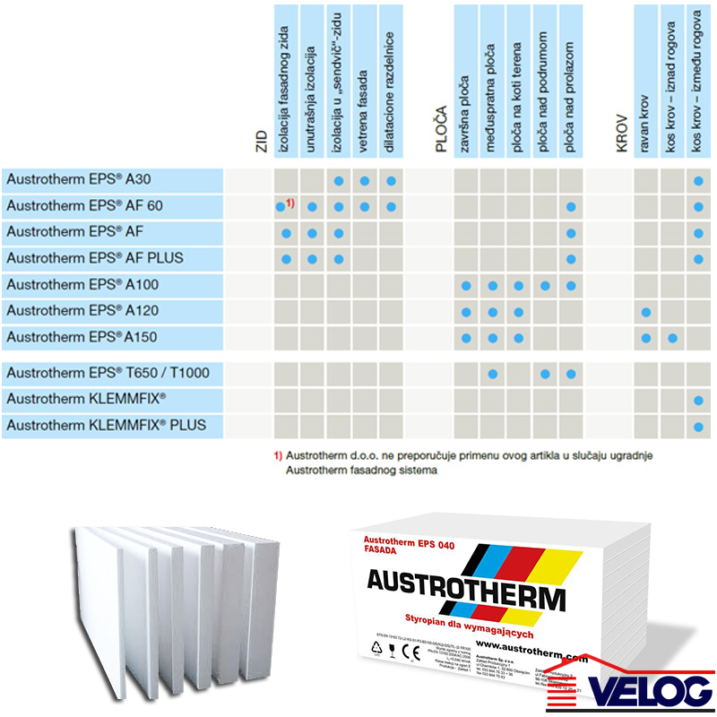 | Prednosti | • Za svođenje Vaših troškova grejanja na minimum, neophodna je sveobuhvatna termička izolacija Vaše kuće. Danas su na primer u Austriji (pogotovo u Beču) svi montažni, kao i većina stambenih objekata tzv. objekti niske energetske potrošnje; • Ukoliko koristite termoizolaciju Austrotherm EPS®, sačuvaćete životnu sredinu (okolinu) čistom (kroz redukovanje prisustva štetnih materija poput CO2 , NOx , SO2 ); • Sve vrste materijala Austrotherm EPS® sastoje se od vazduha (procentualno čak 98%!). On ne iritira ljudski organizam (kožu, oči, pluća) pri dodiru, a podleže i permanentnoj kontroli kvaliteta u Austrothermo-vim laboratorijama i u eksternim institutima za ispitivanje materijala. |