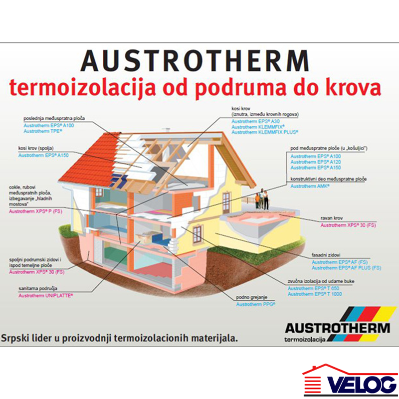 | Dodatne Informacije | Austrotherm je već godinama prepoznatljiv u Srbiji i u njenom okruženju kao lider u proizvodnji najkvalitetnijih termoizolacionih ploča na bazi ekspandiranog (EPS) i ekstrudiranog polistirena (XPS). Sa ovim proizvodima se kuće izoluju od podruma do krova. Značajno poglavlje predstavlja fasadna termoizolacija, a Austrotherm tu nudi kako termičku izolaciju sokle (Austrotherm XPS), tako i termoizolaciju fasadnog zida. |