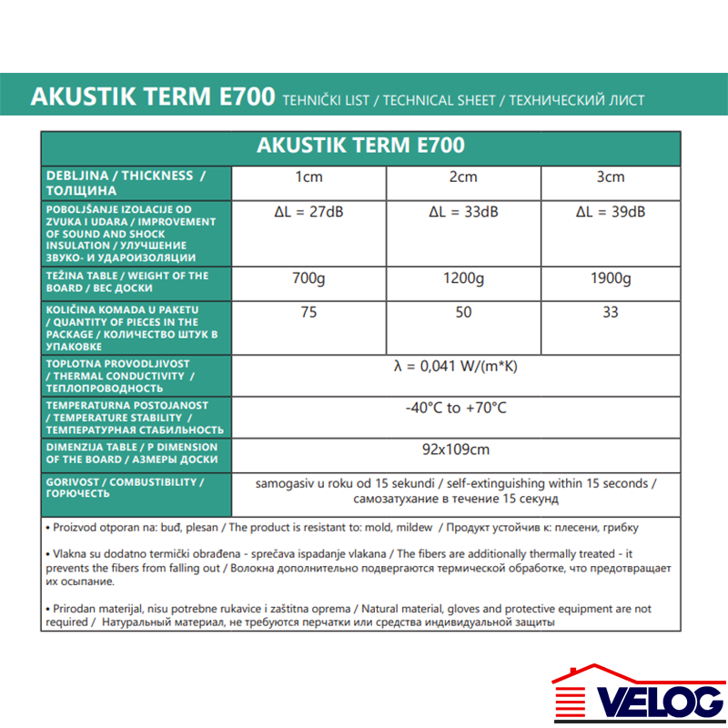 | Prednosti | Ono što izdvaja Akustik Term E700 u odnosu na ostale proizvode su rezultati ispitivanja u Institutu IMS, koji ovaj proizvod čine najboljim materijalom na tržištu za upotrebu u sistemu plivajućih podova. Ispitivanja su pokazala da se Akustik Term E700 u manjim debljinama može koristiti kao odlično rešenje za ispunjavanje usklađenosti sa vrednostima predviđenim važećim propisima. |