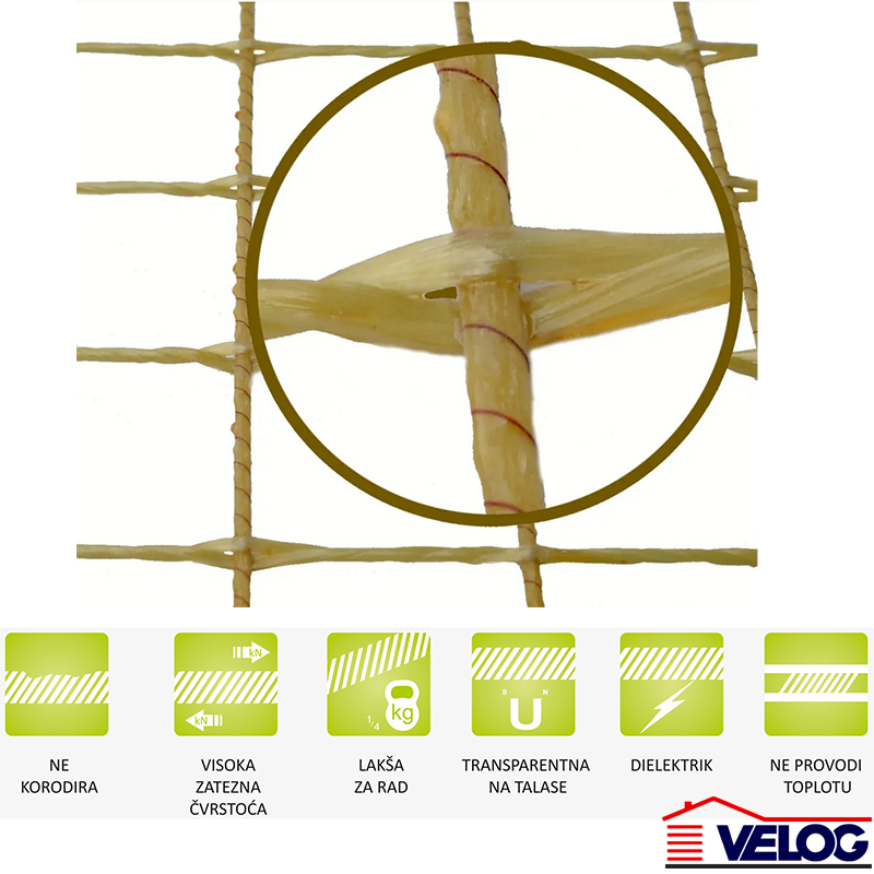 | Prednosti | • Otpornost na vlagu i hemikalije – bez korozije tokom eksploatacije; • Niska toplotna provodljivost – sprečava pojavu "hladnih mostova"; • Manja težina u odnosu na čelik do 5 puta (lakši transport i ugradnja); • Visoka zatezna čvrstoća (veća od čelika po jedinici mase); • Lako se seče i ugrađuje bez posebnog alata; • Ekološki prihvatljiv proizvod, bez uticaja na armirani beton; • Dugotrajna zaštita bez dodatnih premaza; • Pogodna za temelje, podne ploče, staze, ograde, vinogradarske i poljoprivredne objekte. |