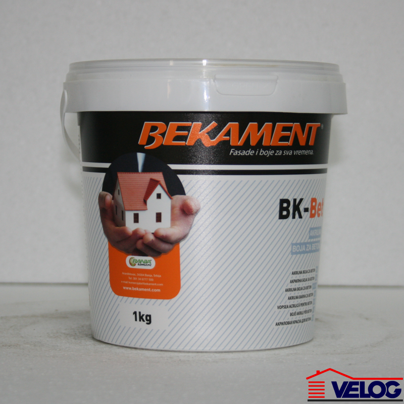 | Priprema Podloge | Podloga na koju se boja nanosi mora biti čvrsta, čista i suva, bez slabo vezanih delova, masnih mrlja i sl. Odgovarajuće podloge su sve betonske površine (stare najmanje 3 meseca), vlaknasto-cementne ploče, fabrički gotovi betonski elementi i sl. Podlogu je potrebno pre nanošenja premazati BK-Grund Universal podlogom ili BK-Bet-om razređenim sa oko 25 % vode. Vreme sušenja podloge‚ pri normalnim uslovima, pre nanošenja boje iznosi min. 12h. U slučaju bojenja površina prebojenih uljanim bojama, lakovima i sl. neophodno je izvršiti kompletno uklanjanje postojećih premaza. |