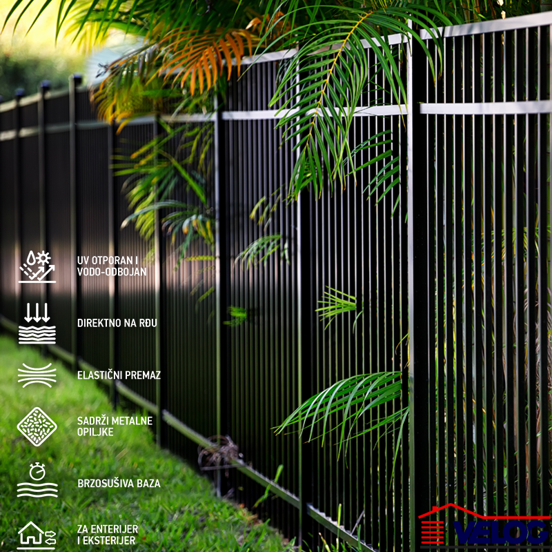 | Prednosti | Idealna je za dobijanje efekta kovanog gvožđa na metalu, otklanjajući sve nedostatke metala. Metalni opiljci pružaju reljefni izgled. Ovu boju karakteriše izuzetna tvrdoća, elastičnost, adhezija, otpornost na udar i zaštita od atmosferskih uticaja. Ova boja poseduje sve odgovarajuće ateste, u sebi sadrži dva blokatora korozije i pruža kvalitetnu zaštitu metala od 5 do 15 godina u raznim vremenskim uslovima. • Posao se završava u jednom danu • Pravi uštedu u materijalu • Ispravlja nedostatke metala nastalih prilikom izrade • Štiti od 5 do 15 godina • Otporna na sve atmosferske uslove • Velika pokrivna moć • Elastični premaz koji ne puca • Nanosi se direktno na cink |