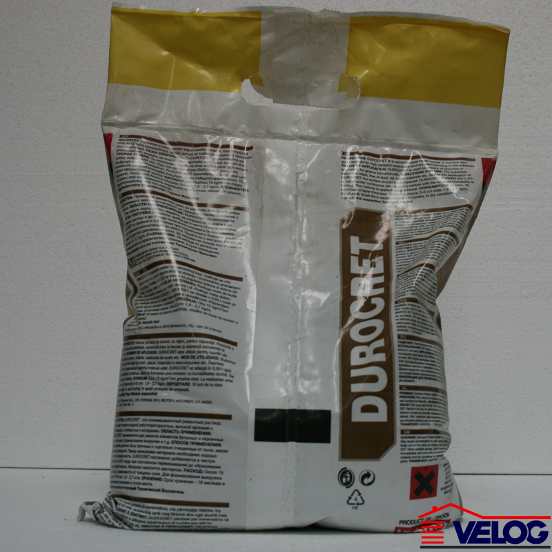 Dodatne Informacije • Temperatura tokom primene treba da bude minimum +5°C. • Po toplom vremenu DUROCRET zahteva kvašenje po nanošenju, kako bi se zaštitio od prebrzog gubitka vode. • DUROCRET sadrži cement i sa vodom reaguje alkalno, tako da je klasifikovan kao iritant. • Pažljivo proučite upozorenja i uputstva ispisana na ambalaži proizvoda.