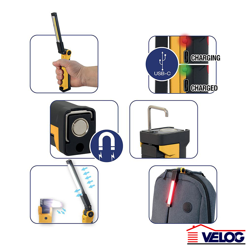 LED Radna Svetiljka 10W 800lm 1800mAh. Commel radna prenosiva LED svetiljka snage 10W, namenjena koriscenju u radionicama, garazama, kod kampovanja i slicno. Ugradjena baterija od 1800 mAh pruza autonomiju rada od 2h. Poseduje robusno kuciste, snazan magnet i mogucnost rotacije za 360 stepeni. Emituje svetlost jacine od 800lm, koje je podesivo u 6 razlicitih nivoa: 100%, 50%, 25%, RED, FLASH i XPE LED 100%. Takodje, poseduje LED indikator napunjenosti baterije, koja se dopunjava putem USB-C porta. Dimenzije svetiljke su 28 x 36 x 148 mm.