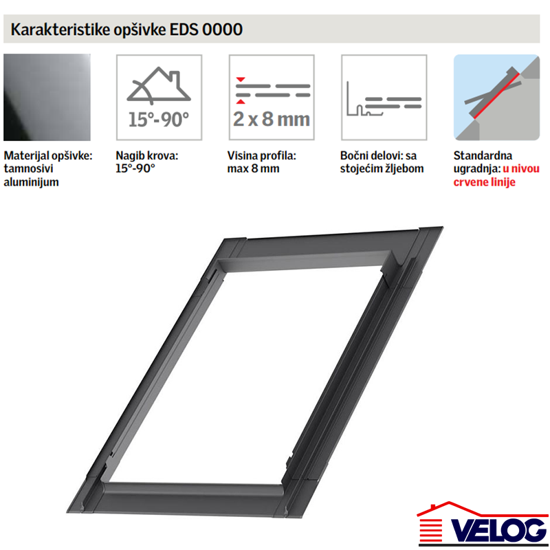 | Prednosti | • Savršen spoj krovnog prozora i krovnog pokrivača • Bez posebnih zahteva za održavanjem, bez korozije • Testirana na ekstremne vremenske uslove • Brza ugradnja • Ne sadrži BDX termo i hidroizolacioni set – potrebno ga je poručiti posebno |